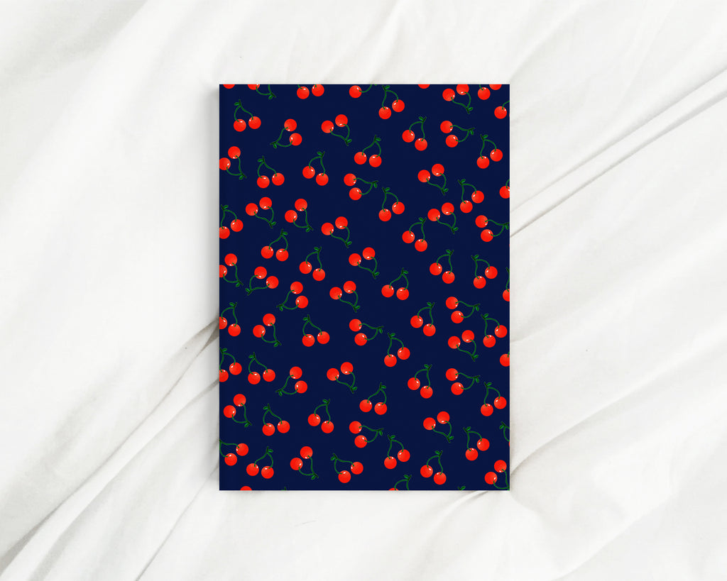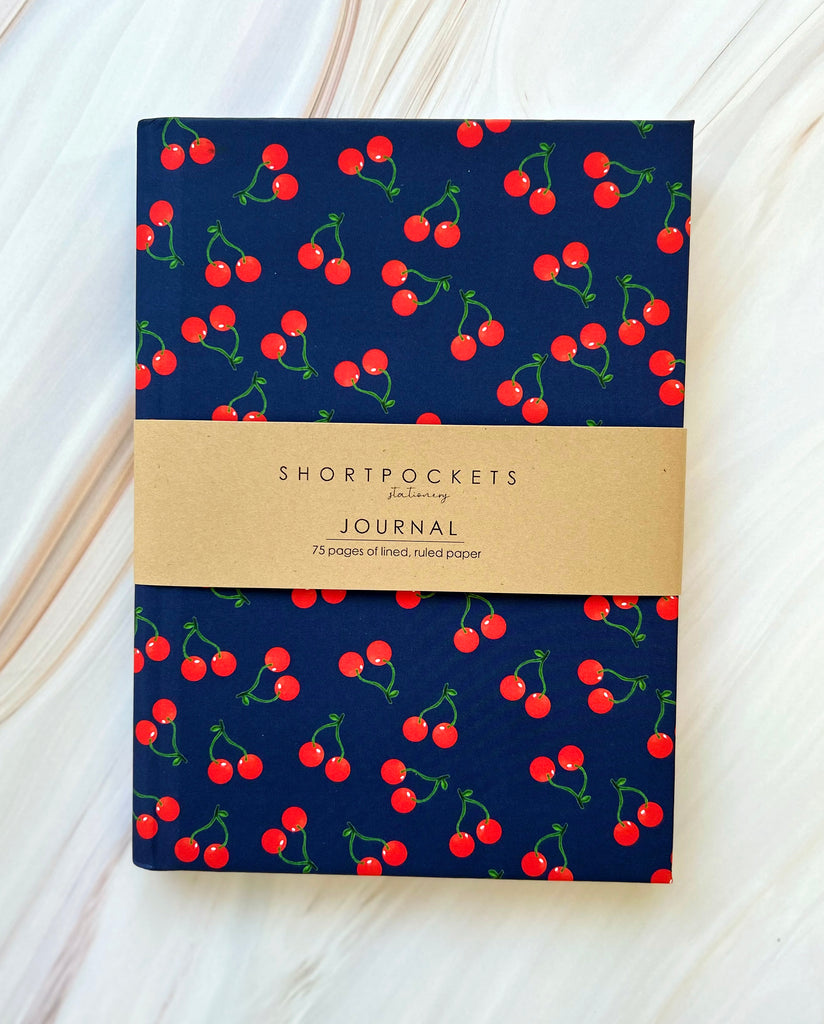 Our Cherries 5.75 x 8 Hard Cover Journal contains 75 pages of lined, ruled paper. Matte laminate coating on cover.