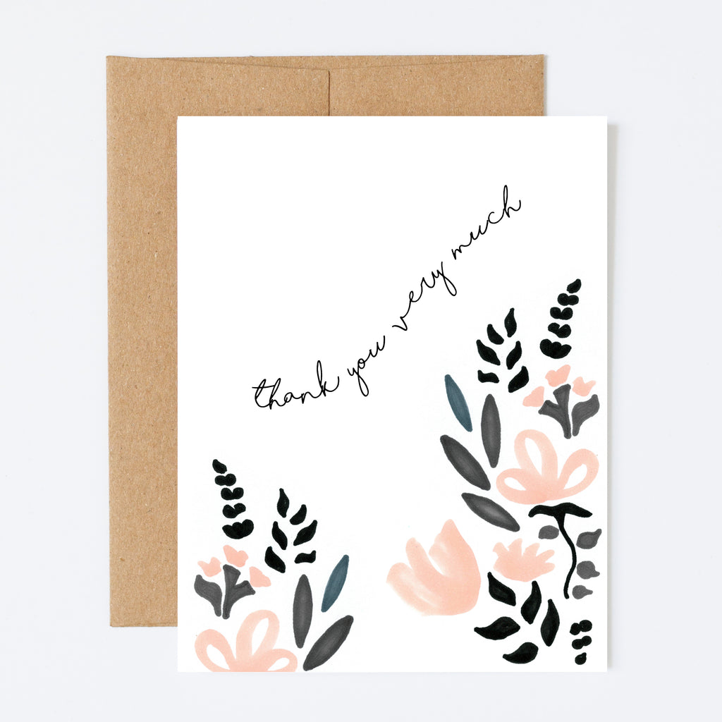 4.25 x 5.5 folded card printed on white cotton card stock. Comes with a brown Kraft envelope. Sold as a single card or as a set of 8.