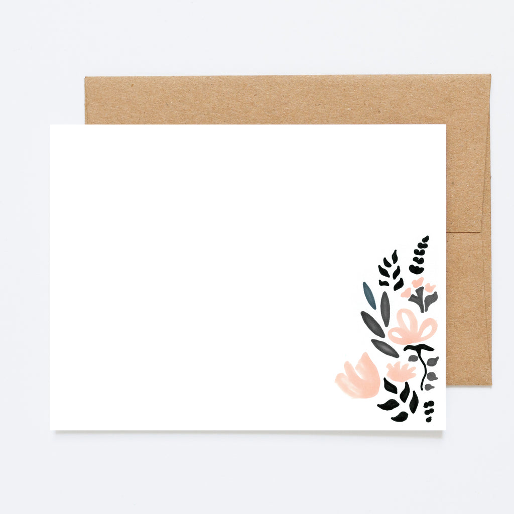 4.25 x 5.5 flat cards printed on white cotton card stock. Comes with brown Kraft envelopes.